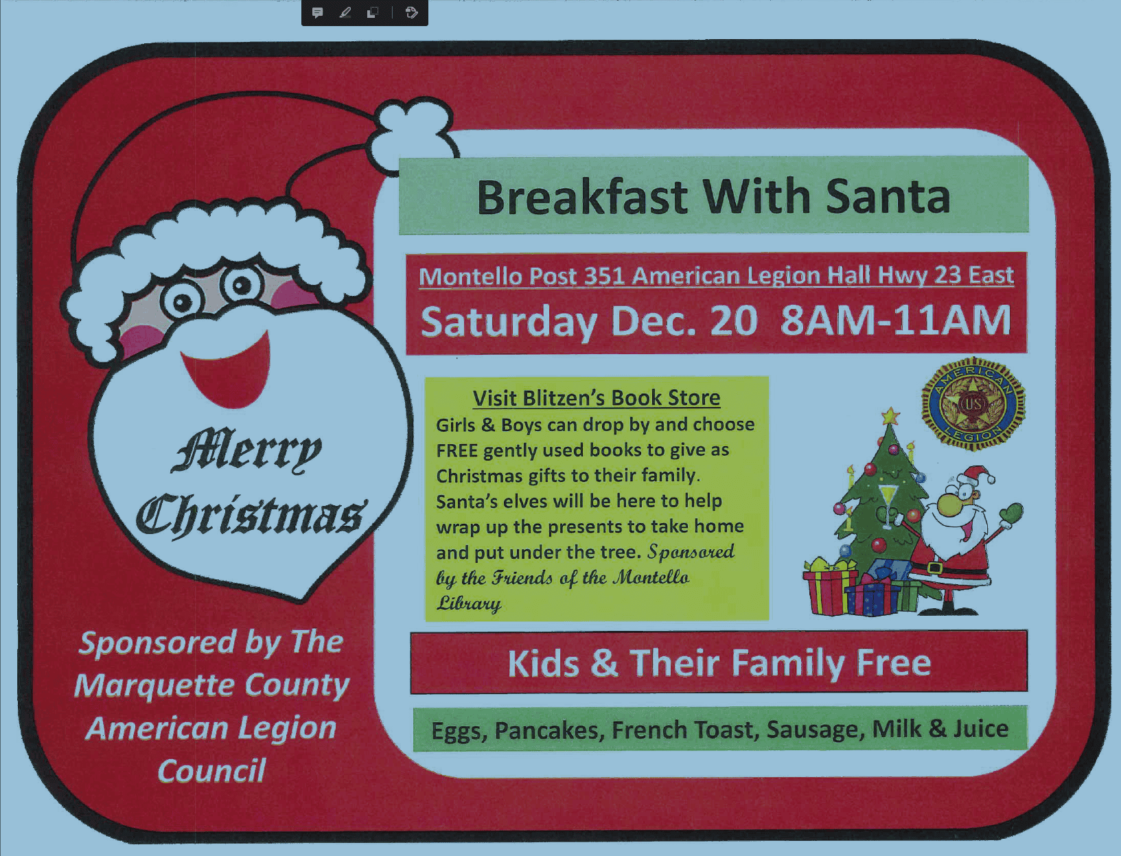 Montello Post 351 American Legion will be hosting Breakfast with Santa on Saturday, Dec 20 from 8 am to 11 am. Free for kids and families featuring Blitzen’s Book Store sponsored by the Friends of the Montello Library. Eggs, pancakes, French toast, sausage, milk and juice will be served. Come out and see Santa and Mrs. Claus! This event is sponsored by the Marquette County American Legion Council